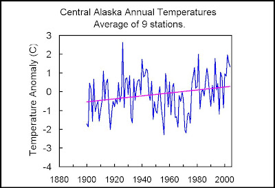 I recently completed a study of central Alaska's climate. For this study I computed the average annual temperature for nine long-term Alaskan stations (and station combinations), which are: Eagle/Dawson, Ft. Yukon/Central, Fairbanks University, McKinley Park, Talkeetna, Gulkana/Kennecott/Chitina/McCarthy, Yakutat, Cordova, and Valdez. Then I averaged the nine stations for a regional mean. The data source was NCDC.